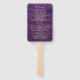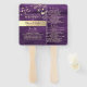 Elegant, modern, rustic barn wood purple wedding program hand fans with gold floral lace, string lights and trendy calligraphy script.