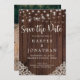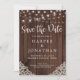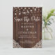 Rustic Wood String Lights and Lace Wedding Save the Date Photo Announcement featuring a rustic wood background with twinkling strings of lights and vintage style lace in the bottom corners. The words "Save the Date" are set off in elegant yet rustic typography, making this the perfect design for your boho or country wedding. Add your photo to the back for the perfect announcement of your exciting news!