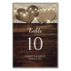 Rustic wedding table number card featuring two burlap hearts against a rustic wood, burlap and lace background adorned with string lights.