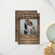 Your wedding photo is accented with a rustic, country, brown weathered wood plank background and soft yellow glow string lights along with the title of THANK YOU and your wedding date in a country western hand-printed font and your name in a rough brush script font. The back of the card features the same wood plank background and offers a place to add a pre-printed thank-you message (or delete the sample text to leave blank for personal handwritten notes of gratitude).