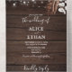 Boho rustic wedding invitation features neutral flowers, dried palm leaves and string lights on a wood background.