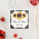 Personalised wood and sunflower wedding paper napkins featuring sunflowers on a barn wood background adorned with string lights. Matching items available.