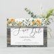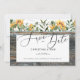 Rustic Wedding Save the Date. Dark Wood Background. String of Lights. Sunflowers. Simple.
