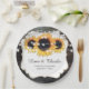Custom rustic wood and sunflower wedding paper plates featuring sunflower flowers and string lights on a barn wood background. Matching items available to complement these rustic floral wedding paper plates. Easily personalize to any occasion.