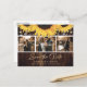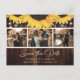 Custom rustic sunflower wedding photo save the date postcards featuring a photo collage and sunflower flowers against a rustic wood background adorned with string lights. Easily personalise this rustic sunflower photo save the date postcard with your images and wedding details including a wedding website, if desired.