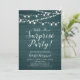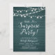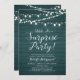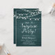 Celebrate your special day with this rustic surprise retirement party invitation! This design features a stylish script typography and light strings on a teal green rustic wood background. Perfect for a garden party, barn party, or backyard party.