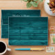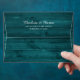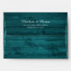 Personalised teal rustic wood wedding envelopes with a return address on a barn wood background.