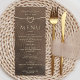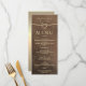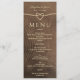 Simple, elegant, rustic wood wedding menu with gold foil rope heart and modern calligraphy script.