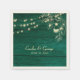 Elegant, modern, rustic barn wood green personalised wedding napkins with gold floral lace, string lights and trendy calligraphy script.