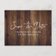 Simple rustic wedding save the date postcard featuring a barn wood background.