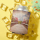 Can cooler with a scenic photograph. A wooden bridge leading towards a pathway surrounded by forest trees changing colour.
