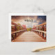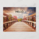 A hello postcard with a scenic looking wooden bridge leading into a pathway surrounded by forest trees changing colour.