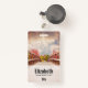 Personalised name badge with a scenic photograph. A wooden bridge leading towards a pathway surrounded by forest trees changing colour.
