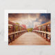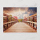 A postcard with a scenic looking wooden bridge leading into a pathway surrounded by forest trees changing colour.