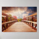 Poster with a scenic photograph. A wooden bridge leading towards a pathway surrounded by forest trees changing colour.