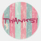 A sticker which says thanks! in a cool funky font. The background is a pink and Green Rustic Wooden Fence Grunge Texture.