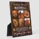 Personalised dog photo plaque featuring a rustic wood background, 6 precious pictures of your beloved pet, gold heart pawprints & glitter, the text "in loving memory of", your dogs name, birth/death dates, and the sympathy quote "your presence we miss, your memory we treasure, loving you always, forgetting you never".
