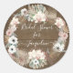 Rustic Wooden White Floral Palm Greenery Foliage Bridal Shower Classic Round Sticker for envelope seals, favour gift bags or other bridal shower decor uses. Dark distressed and weathered brown barn wood boards set off the delicate, watercolor artwork of elegant white orchids, khaki tan palm foliage, boho style dried tropical leaves and muted sage fern greenery wreath. Copyright, Audrey Jeanne Roberts.