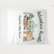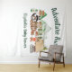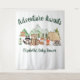 Cute rustic baby shower tapestry welcome sign and photo backdrop featuring a watercolor illustration of woodland animals with their tent and campfire camping in the mountains and forest and "Adventure Awaits" and the mother-to-be's name in a dark hunter green script.