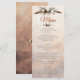 A perfect complement to your floral wedding theme, this menu features an assortment of white, hickory and burgundy flowers, woodland leaves and a set of rustic feathers. Customise with menu entries like your first, second, entree or dessert written on a beige, chestnut, taupe and umber hand painted canvas. The reverse side features your custom initials with a cursive "&" symbol displayed above a set of rustic and woodland flowers, leaves and antler. Available in the Rustic Woodland Feathers and Floral Bloom Collection.