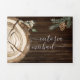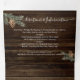 Rustic Watercolor Woodland Wedding all in one Tri-fold invitations that come with response cards RSVP, Details and info and a photo of the couple. Features pine branches, pinecones, log slices, feathers and birds on a dark rustic wood background. Perfect for an outdoor, barn, forest, country or nature wedding!