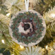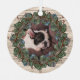 Rustic single pet photo metal ornament with leafy greenery and winter berries wreath on a pale wood background.