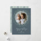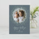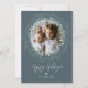 Holiday photo card featuring a rustic wreath of leaves and twigs on a pewter-coloured background. Brush script calligraphy adds a classy touch.