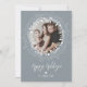 Holiday photo card featuring a rustic wreath of leaves and twigs on a silver-coloured background. Brush script calligraphy adds a classy touch.