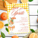 Rustic Elegant Cute Chic Love At First Spritz Bridal Shower Invitation - Featuring a watercolor Aperol spritz with an orange slice garnish, adorned with a coquette orange bow. The invitation has a rustic, gingham plaid yellow background and a white arch frame. The words "Love at first Spritz" are written in a mixture of refined script calligraphy and elegant block dark burnt orange text. Edit this bridal shower invitation template with your own event details. Also available as an instant digital download, easily send via text, email or social media.
