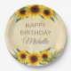 Rustic yellow and brown sunflowers with beautiful green leaves "Happy Birthday" custom paper plates for women personalised with her name.