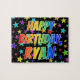 This lively, exciting, birthday-themed jigsaw puzzle design has the message "HAPPY BIRTHDAY, RYAN" with the characters having a colorful rainbow spectrum inspired gradient pattern, along with a vibrant stars background pattern. A vibrant puzzle like this might be a fun way to send birthday greetings to somebody named Ryan. [~Z0000468]