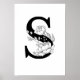 Elegant S letter monogram poster with flowers and lives. Black and white botanical illustration. Initial letter poster nurseries, bedrooms, part of home decor. Personalised gift idea.