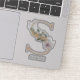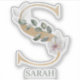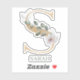 Letter S monogram floral. Letter S in golden brown texture accented with green watercolor compound leaves, flower blossoms and gold dust. Personalised with name in matching font.