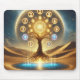 In the heart of an endless desert, a divine Tree of Life stands tall, radiating golden and sapphire energy. Its luminous branches stretch towards the heavens, adorned with floating numerology symbols (1 to 9) that glow with sacred wisdom. The tree’s roots are deeply embedded in a mysterious, glowing oasis, where shimmering waters reflect its ethereal light. Surrounding it, vast sand dunes extend under a celestial sky filled with twinkling stars and a giant full moon, creating an atmosphere of mysticism and wonder.