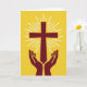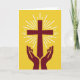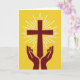 This design shows a centered, dark reddish-brown cross set against a glowing golden-yellow background, giving the scene a sunlit, uplifting look. Bright white rays spread outward from behind the top of the cross, like beams breaking through the sky and filling the space with light. Beneath the cross, two matching reddish-brown hands are drawn symmetrically, cupped upward as if gently supporting it with the care you might see between close friends. The simple shapes keep the focus on the quiet connection between the hands and the cross, like an unspoken promise held steady. Any wording sits neatly near the top in small white lettering, with a second short line placed near the bottom in the same color so it balances the design. The warm yellow field feels like a soft halo around everything, and a small 🌷 adds a tender touch without distracting from the main image. White rays fan out evenly while the cross and hands remain sharply centered on the golden-yellow field.