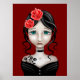 This unique design features a sad looking girl with two red roses in her hair. Large blue eyes and a small mouth gives the design a highly stylised and beautiful look. Strands of long black hair can be seen flowing down from the girls head onto the pale white skin on her chest. Three black tribal roses with leaves and swirling lines are tattooed on the girls shoulder which echoes the flowers in her hair.