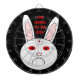 This awesome dartboard features the sad face of a white rabbit. This rabbit has a big frown on its face because it is a lab rabbit that has had cosmetics tested on it. The whites of its eyes are red and swollen. The design has been created to bring to attention the unnecessary suffering caused by the testing of cosmetics on animals. The bold red text reads “stop animal testing now!”
