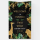 This jungle safari themed second birthday party welcome banner features gold faux foil animals (giraffe, lion and monkeys), gold and green jungle foliage, and a sprinkling of gold confetti on a black background. The words "Welcome to [child's name's] Two Wild Birthday Party" appear in gold and white lettering. Customise by adding the name of the birthday boy or girl in gold text and the party date in white.