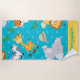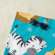 This cute kids safari themed beach towel features a nice animal design. Set against a blue polka dot background, your little one will enjoy the tigers, lions, elephants, giraffes and zebras illustrated on this towel. Best of all, there is place to insert the child's name in blue font on a yellow background. Personalise your cute beach towel today!