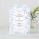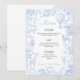 Elegant Blue Toile de Jouy Floral Baby Shower menu, featuring a charming safari animal theme. This beautifully designed menu template showcases a hot air balloon along with adorable safari animals like a giraffe, elephant, zebra, and lion, all set against a blue floral chinoiserie background. With its vintage aesthetic and graceful typography, this menus template sets the tone for a timeless celebration. Fully customisable to match your event details, it's the perfect choice for a boy's safari-themed baby shower, blending charm and sophistication.