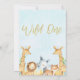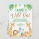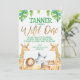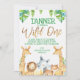 Cute jungle or safari animals animals first birthday invitation for a little boy featuring two giraffes, a rhino, lion and tiger. The design also features a a faux gold foil calligraphy heading. This design is a cute way to invite your little one's guests to his first birthday party.