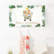 Cute predominately green and yellow safari themed boys birthday party banner featuring a truck full of jungle animals, some foliage, a yellow balloon, frangipani flowers.
