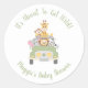 Cute stickers for your safari-themed baby shower featuring an illustration of baby animals (lion, zebra, elephant, giraffe and monkey) piled into a safari vehicle and "It's About To Get Wild!" and the name of the mother-to-be in a jungle green script.