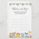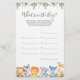 Safari animals themed baby shower guess what's in the bag game card features a watercolor safari animals illustration and watercolor greenery eucalyptus garland and elegant handwritten style font.