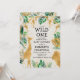 This "wild one" jungle safari themed baby shower invitation features gold faux foil animals (giraffe, lion and monkeys), gold and green jungle foliage, and a sprinkling of gold confetti on an ecru background. Add the name of the mum-to-be and shower details in black text. A coordinating jungle foliage pattern in green and gold decorates the back of the card.