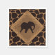 Giraffe animal skin background with a dark-chocolate brown elephant silhouette set in the centre of a medium-brown grassy "textured" square bordered with a pattern of decorative tall-grass blades.