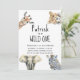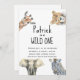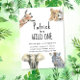 Safari Jungle Birthday invitation featuring a watercolor illustration of a giraffe, leopard, elephant and zebra.