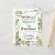 Sweet safari themed first birthday invitation featuring some safari party animals, party hat, tropical foliage and a modern calligraphy image heading. This a year of love and a year of fun safari themed first birthday invitation is ideal for a party animals birthday.