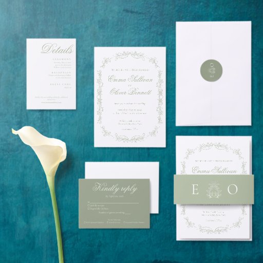 Inspired by classic garden weddings and natural forms, each detail is carefully illustrated to evoke refinement, simplicity, and quiet beauty. The sage green tones offer a versatile and enduring look that complements both formal and organic wedding styles.