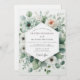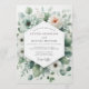 A romantic and ethereal atmosphere is created by a soft wash of watercolor botanicals. Lush sage green eucalyptus leaves and delicate greenery surround elegant white anemones with striking dark centers. Touches of pale blush and cream add gentle warmth to the composition, evoking a modern, airy elegance.